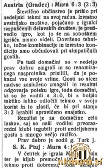Austria je v Murski Soboti prikazala igro, kot jo na našem igrišču še nismo videli - dovršeno tehniko, točne kombinacije in izvrstno kondicijo. Vse to je videlo številčno občinstvo, ki si je z zanimanjem prišlo ogledat to tekmo. Proti dobremu nasprotniku je dobro igrala tudi Mura, ki je že vodila s 3:0 in bi z boljšo taktiko lahko odločila tekmo v svojo korist. Pri rezultatu 3:2 za Muro so črno-beli zapravili upravičeno dosojeno enajstmetrovko.