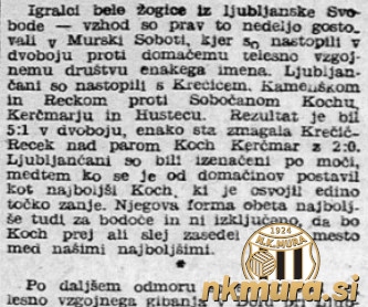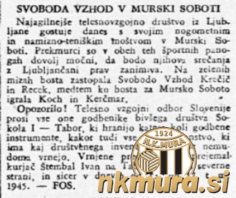 V Slovenskem poročevalcu je bilo objavljeno, da bosta 14. oktobra 1945 v Murski Soboti gostovali namiznoteniška in nogometna ekipa ljubljanske Svobode vzhod.