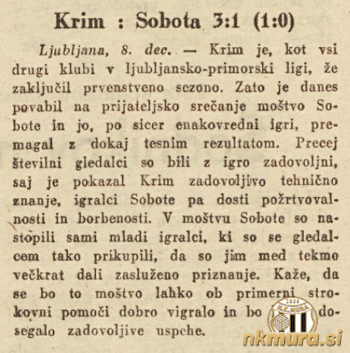 Igra je bila skoraj ves čas enakovredna. Krim je pokazal zadovoljivo tehnično znanje, Sobota pa veliko mero borbenosti in požrtvovalnosti. V moštvu Sobote so nastopili sami mladi igralci, ki so se gledalcem tako prikupili, da so jim med tekmo večkrat dali zasluženo priznanje. Kot vse kaže se bo lahko moštvo Sobote ob primerni strokovni pomoči dobro uigralo in dosegalo zadovoljive uspehe.