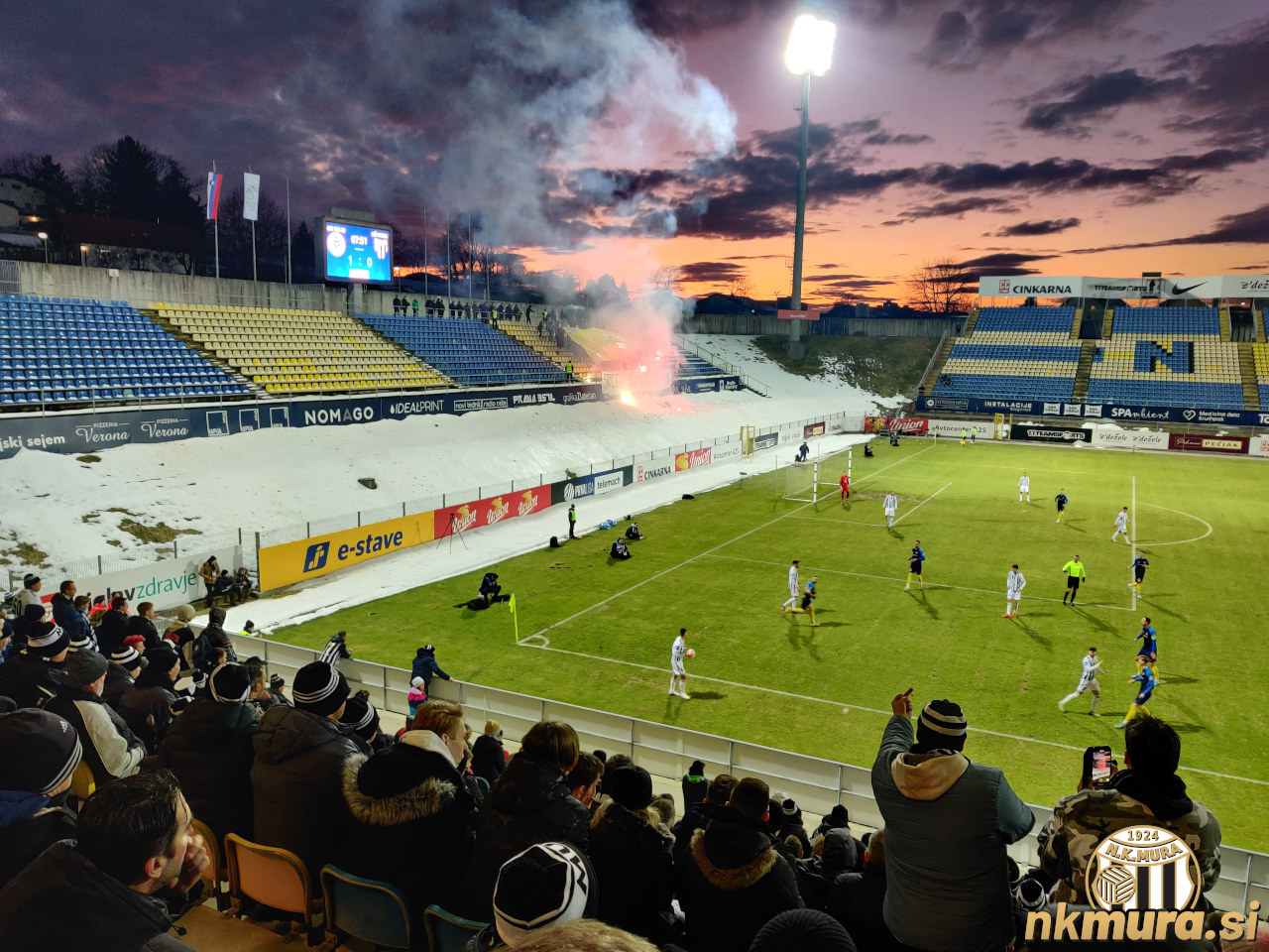 Pogled na glavno tribuno stadiona v Celju. Pristaši Mure so bili stacionirani v dveh desnih blokih. Avtorske pravice: nkmura.si Foto: zaslonski posnetek