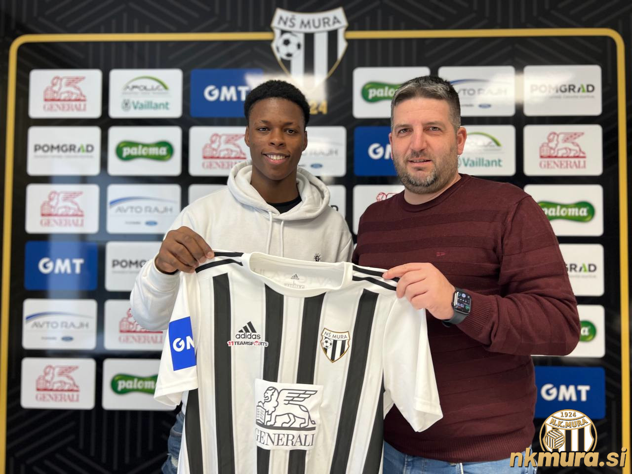 Takole je januarja letos z dresom Mure in športnim direktorjem Denisom Rajbarjem poziral Warner Dwayne Brown. V Sloveniji se mu po pol leta ni uspelo dokazati. Avtorske pravice: nkmura.si Foto: Smiljan Kuhar