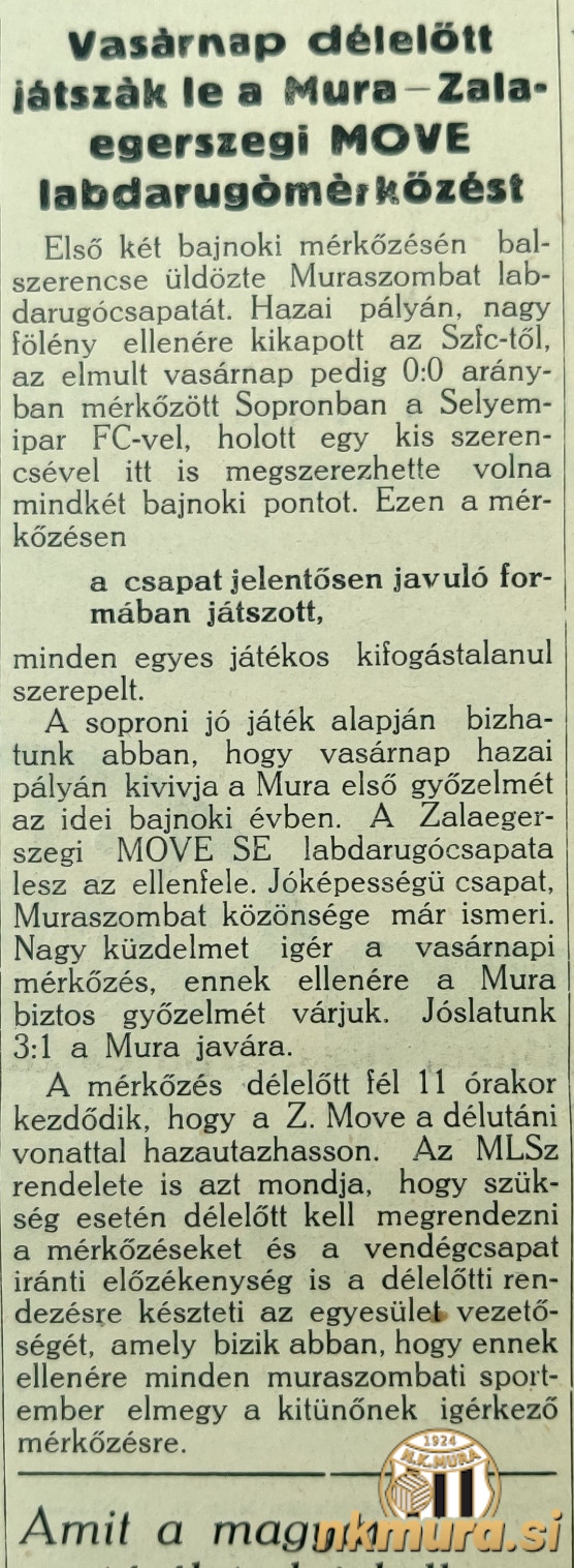 Nogometaši Mure so odigrali drugo prvenstveno tekmo v sezoni 1942/43. Gostovali so v Sopronu in se pomerili z ekipo Soproni Selyemipari ter se razšli brez zmagovalca 0:0