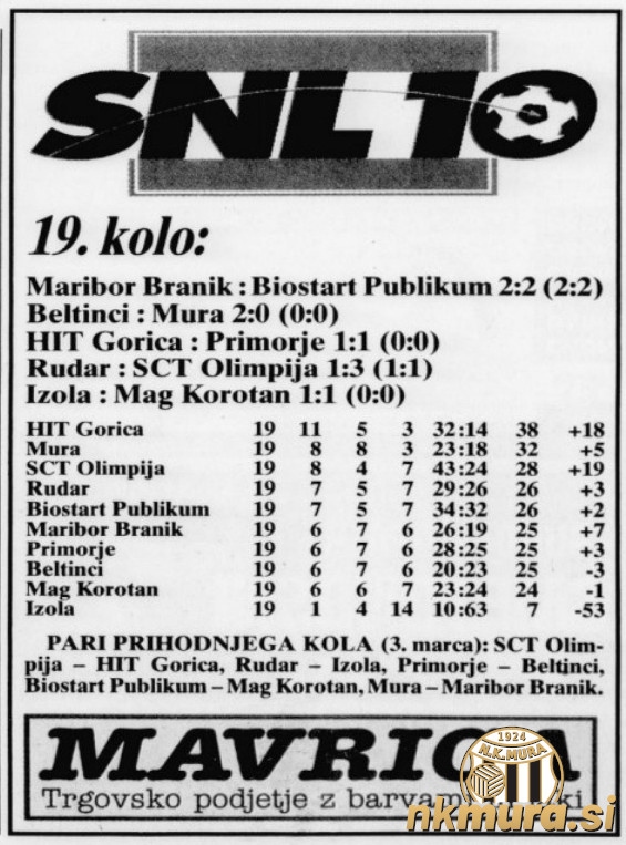 1. Hit Gorica 19 11 5 3 32:14 38 2. Mura 19 8 8 3 23:18 32 3. SCT Olimpija 19 8 4 7 43:24 28 4. Rudar (V) 19 7 5 7 29:26 26 5. Biostart Publikum 19 7 5 7 34:32 26 6. Maribor Branik 19 6 7 6 26:19 25 7. Primorje 19 6 7 6 28:25 25 8. Beltinci 19 6 7 6 20:23 25 9. Mag Korotan 19 6 6 7 23:24 24 10.Izola 19 1 4 14 10:63 7