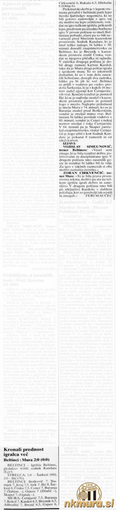 Beltinci: Boškovič, Jeraj, Sirk, Ilić, Šarkezi, Črnko, Cener, Baranja (od 87. Šabjan), Škaper (od 89. Gutalj), Tratnjek, Osterc (od 70. Džafič). Trener: Vojislav Simeunovič.