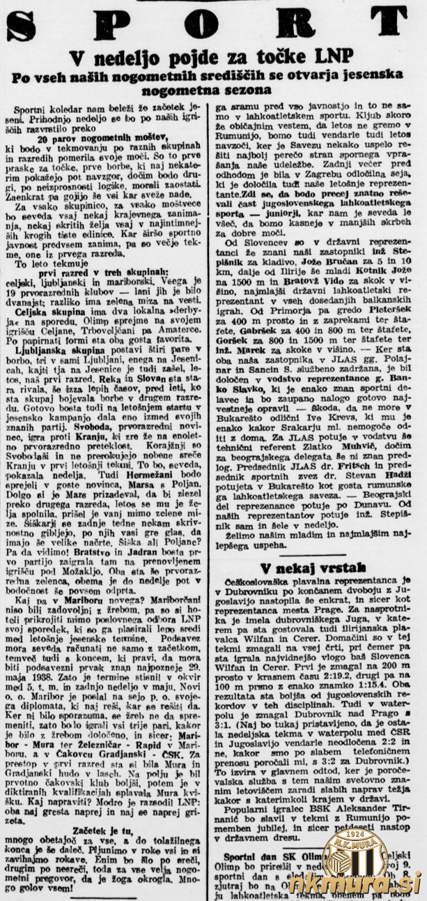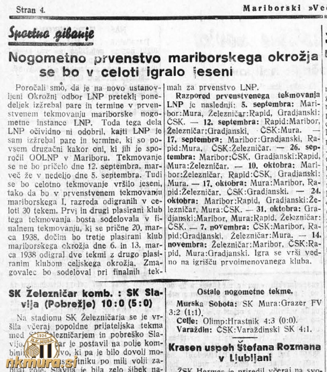 LNP je na svoji seji, 27. avgusta 1937, določila pare tekmovanja v I. razredu mariborske skupine. Po žrebu so se mariborski klubi pritožili, saj se po razporedu v Mariboru vršijo tri nedelje hkrati dve tekmi, kar bi klubske blagajne zelo obremenilo. Vodstvo tekmovanja temu ni ugodilo, tako da razpored ostaja enak. Mura bo prvo tekmo igrala 5. septembra v Mariboru proti I.SSK Mariboru.
