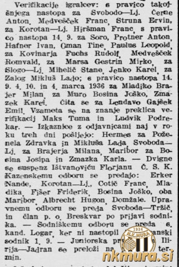 7. septembra 1935 je murin igralec dokončno postal Jože Bosina in Maribora. Spomnimo, da je bil Bosina za Muro že verificiran 3. novembra 1934, vendar le za prijateljske tekme.
