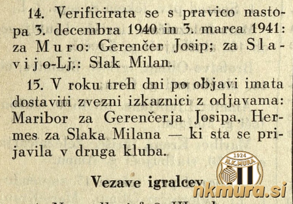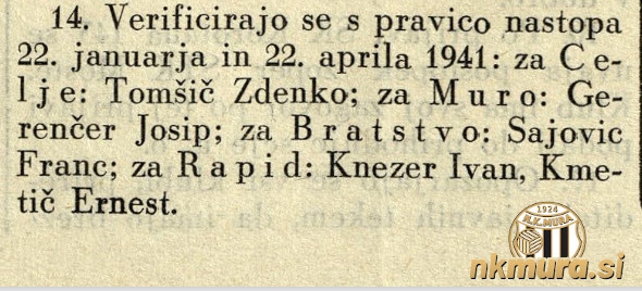 22. oktobra 1940 je bil za Muro verificiran Jože Gerenčer. Pravico nastopa ima od 22. januarja 1941 naprej. Gerenčer je bil sprva verificiran 3. septembra, vendar je Slovenska nogometna zveza njegovo verifikacijo razveljavila, ker je bil vezan na I.SSK Maribor do 31. decembra 1944. Gerenčer se je nato predčasno razšel z Mariborom.