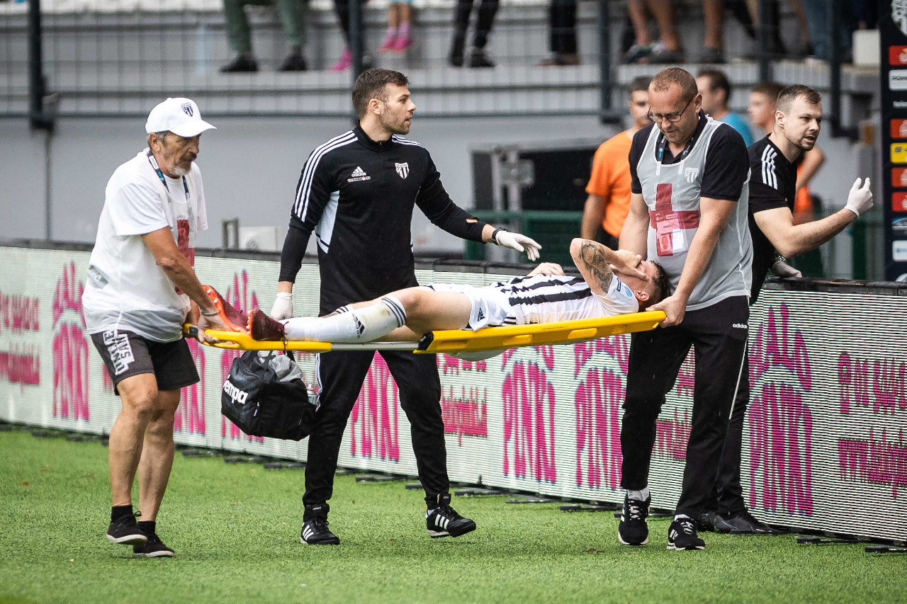 Kai Cipot je v 42. minuti tekme proti Domžalam (22. julij 2023) z igrišča odšel na nosilih. Okrevanje bo trajalo več mesecev. Avtorske pravice: nkmura.si Foto: Jure Banfi
