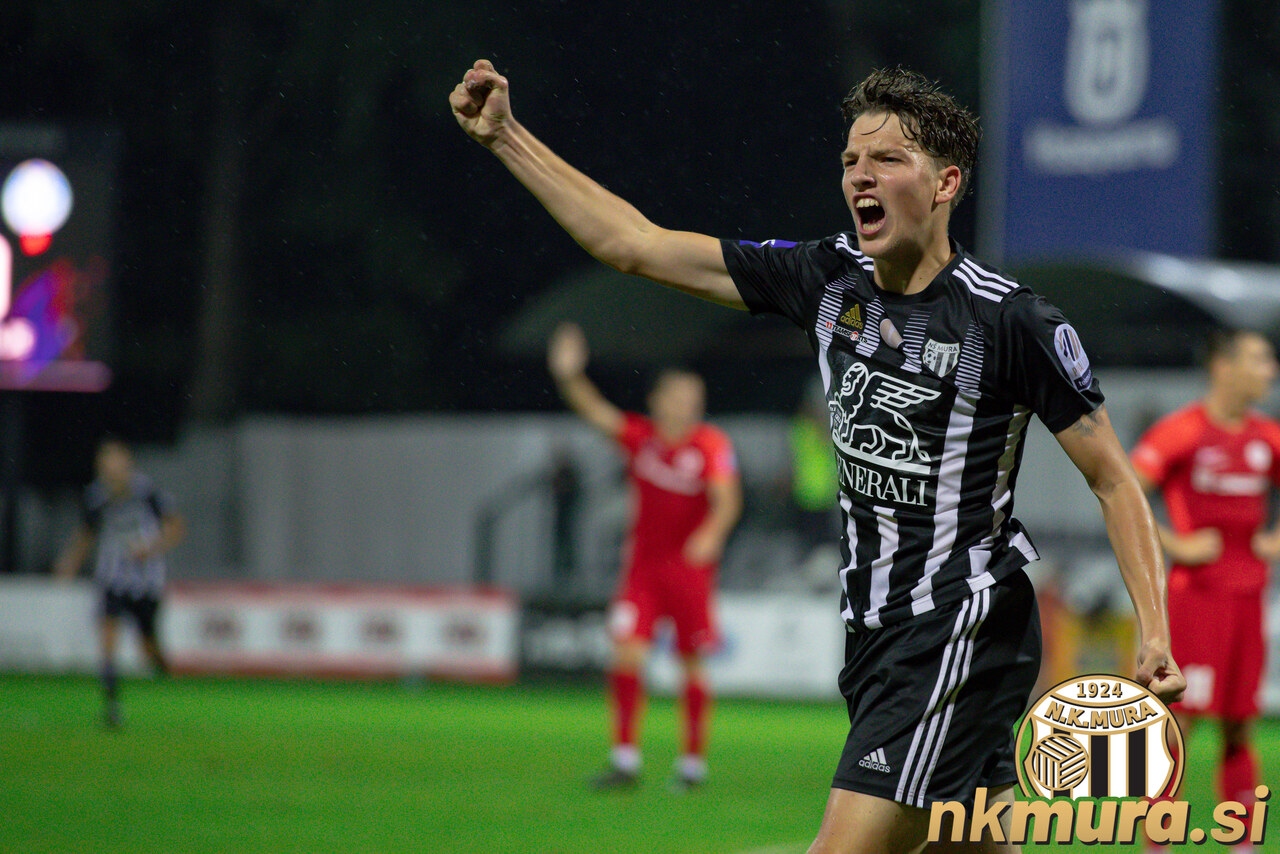 Kai Cipot je bil v 90. minuti na pravem mestu in priboril zmago svoji ekipi. Na tekmi Mura : Celje, 22. avgusta 2021. Avtorske pravice: nkmura.si Foto: Aleš Cipot/fotolens.si