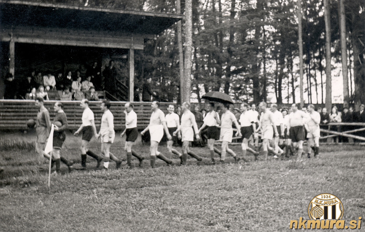 Prikaz prihoda igralcev na igrišče. Prizor ni z 2. svetovne vojne, temveč iz leta 1936, ko sta se na Fazaneriji pomerili ekipi Old boyev Mure in rezervnih oficirjev. Avtorske pravice: nkmura.si Foto: Jože Kološa Kološ