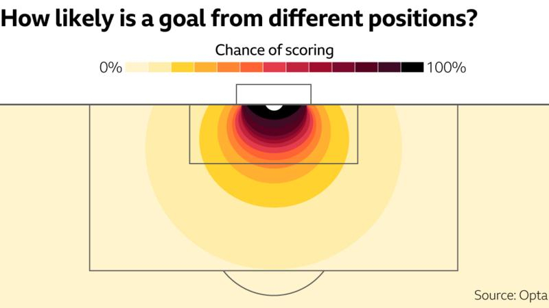 Verjetnost zadetka je večja, če igralec strelja s sredine (ima večji kot od ene vratnice do druge) in je bližje vratom. Igralci v modernem nogometu težijo, da čim več strelov sprožajo s sredine kazenskega prostora in čim bližje vratom. Foto: bbc.com/sport/football/41822455
