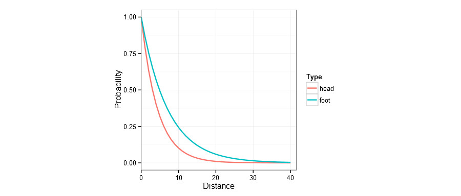Razlike med verjetnostima strela z glavo (rdeča) in nogo (modra). Če igralec sproži z nogo z desetih metrov je verjetnost da doseže zadetek 25%, z glavo pa več kot polovico manjša. Foto: pena.lt/y/2014/08/28/expected-goals-foot-shots-versus-headers/