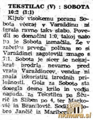 Nogometaši Sobote so v 18. krogu M-V-C lige gostovali v Varaždinu pri Tekstilcu in doživeli visok poraz z 10:2. Naši nogometaši so katastrofo doživeli v drugem polčasu, ko so prejeli kar osem zadetkov. Po prvem polčasu je bilo namreč 2:1 za domačine.