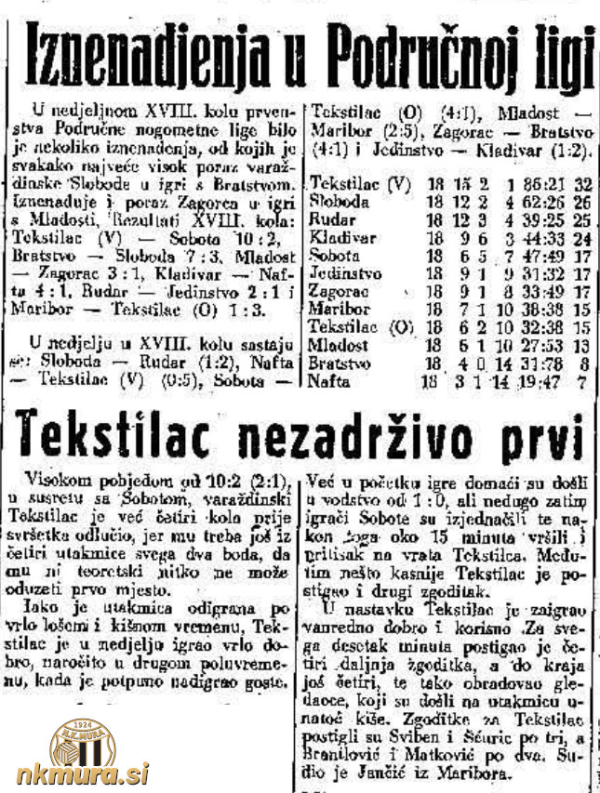 1. Tekstilac (VŽ) 18 15 2 1 86:21 32 2. Sloboda 18 12 2 4 62:26 26 3. Rudar (T) 18 12 3 4 39:25 25 4. Kladivar 18 9 6 3 44:33 24 5. Sobota 18 6 5 7 47:49 17 6. Jedinstvo 18 9 1 9 31:32 17 7. Zagorac 18 9 1 8 33:49 17 8. Maribor 18 7 1 10 38:38 15 9. Tekstilac (O) 18 6 2 10 32:38 15 10.Mladost 18 5 1 10 27:53 13 11.Bratstvo 18 4 0 14 31:78 8 12.Nafta 18 3 1 14 19:47 7