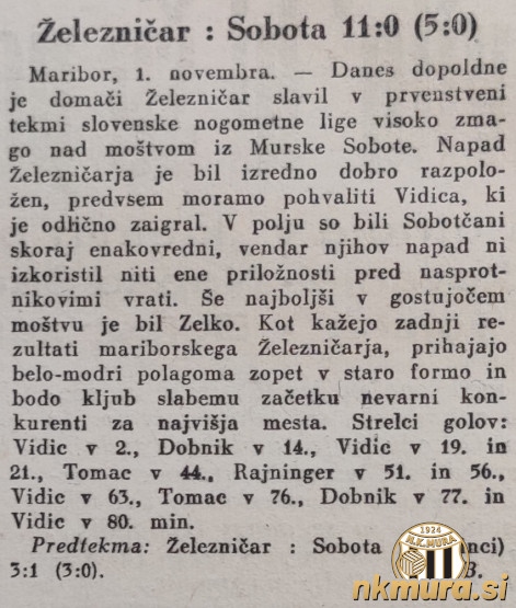 Nogometaši Sobote so se v 6. krogu prvenstva odpravili v Maribor kjer so se pomerili z Železničarjem. Tam so doživeli pravo malo katastrofo in izgubili z 11:0 (5:0).