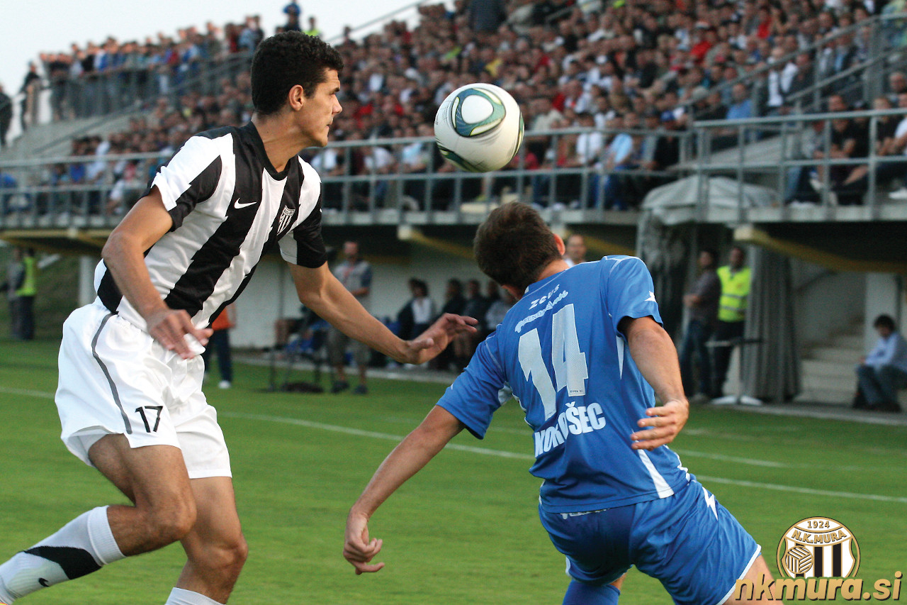Prekmurski derbi med Nafto in Muro iz leta 2011. Na fotografiji sta Nusmir Fajić in Miha Korošec. Tekma je bila odigrana 28. septembra 2011 v Lendavi. Avtorske pravice: nkmura.si Foto: Gregor Čiček