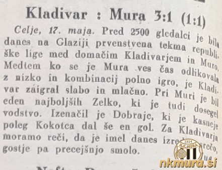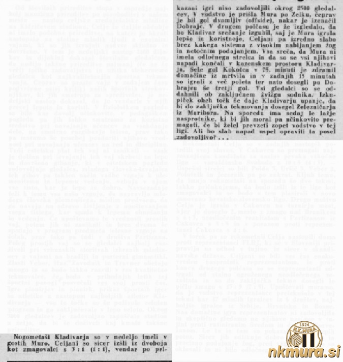 Pred okrog 2500 gledalci je povedla Mura, zadel pa je Feri Zelko. Za domačine je izenačil Dobrajc. V drugem polčasu je izgledalo, da bo Mura prišla do novih dveh točk, saj je igrala lepše in koristneje, Celjani pa slabo z nabijanjem žog ter netočnim podajanjem. Mura si je priigrala številne priložnosti, vendar ni imela strelca, ki bi jih znal pretvoriti v zadetek. V 75. minuti je domačine v vodstvo popeljal Kokotec, ob koncu tekme pa je bil še enkrat natančen Dobrajc. Kot so poročali časopisi je imel Kladivar izredno srečo, Mura pa precejšnjo smolo.