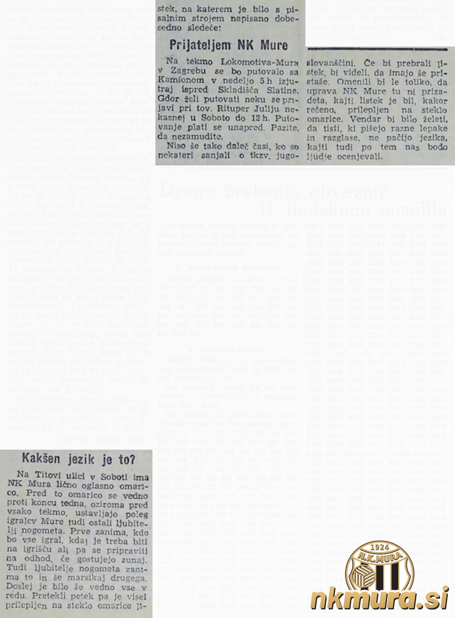 Nekoč, v časih ko ni bilo interneta in facebooka, televizija pa je komaj prodirala v hiše naših prednikov so ljudje večinoma brali časopise in oglasne table. Mura je svoje pristaše obveščala prek oglasne omarice, ki se je nahajala na Titovi oz. današnji Slovenski ulici. Pred omarico pa se niso ustavljali le simpatizerji, temveč tudi igralci Mure. Prebrali so lahko kdo vse bo igral kdaj je potrebno biti na igrišču ali pa se v primeru gostovanja pripraviti za odhod.