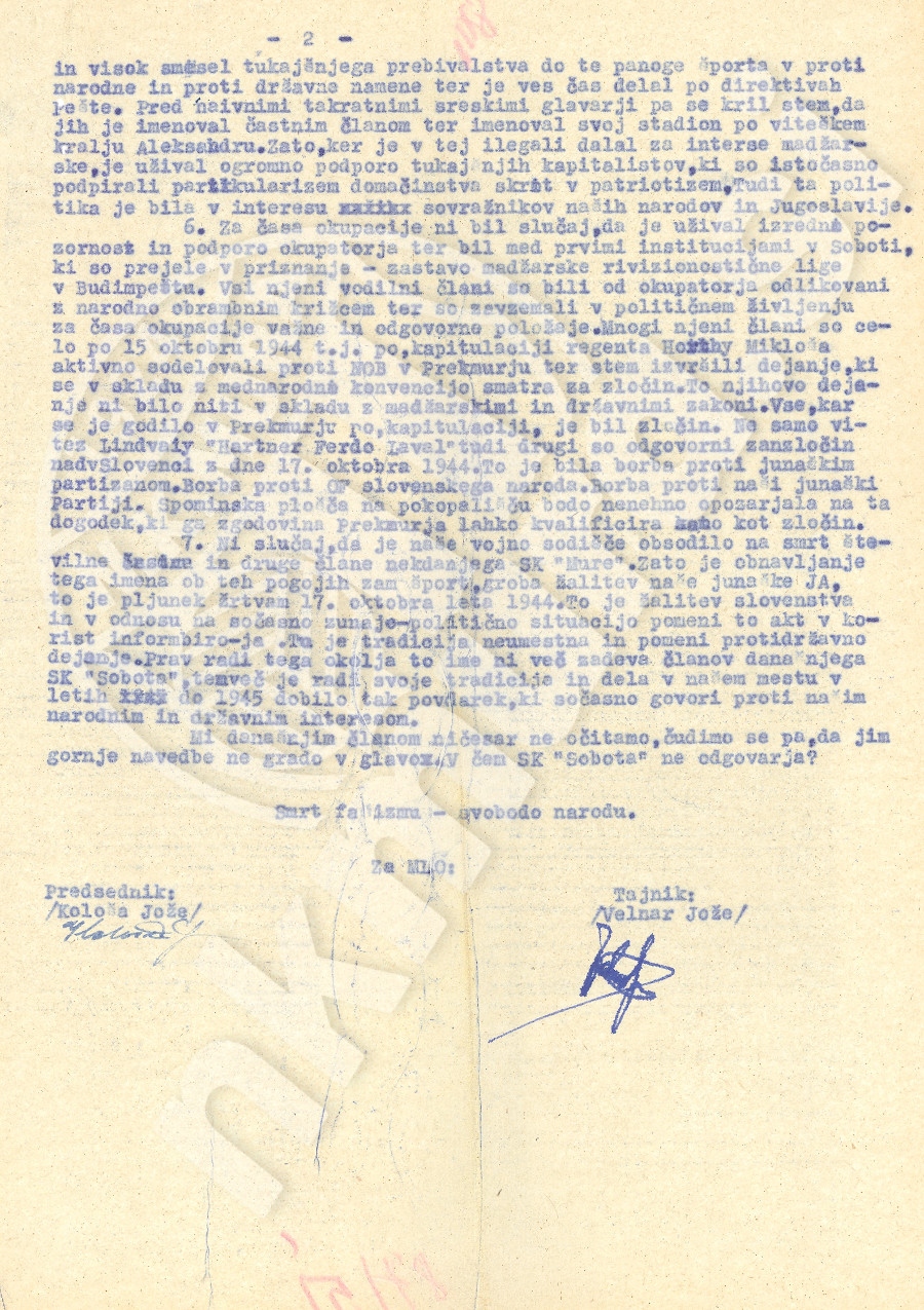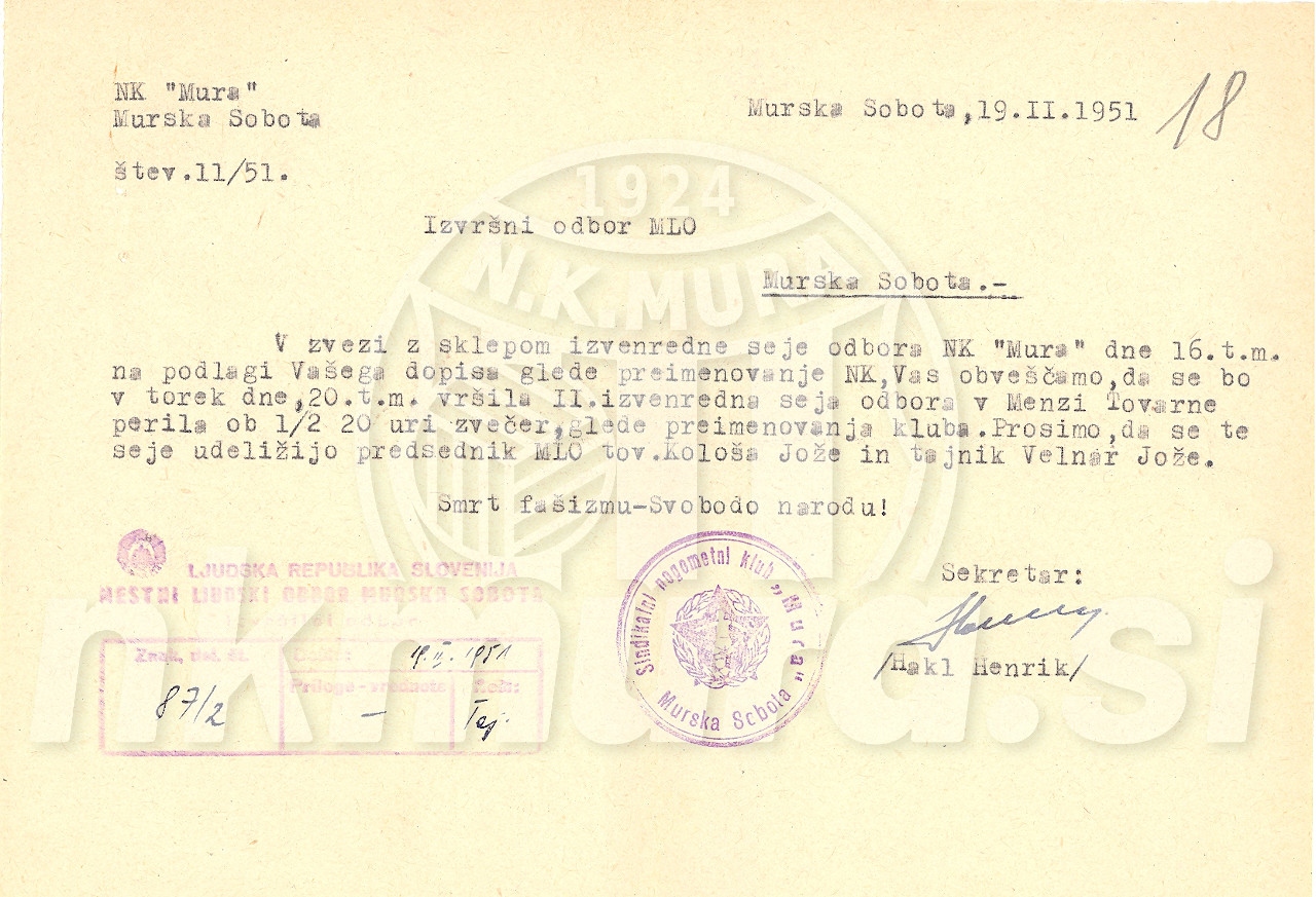 Kmalu po preimenovanju pa je med oblastjo v Murski Soboti završalo. Enajst dni po spremembi imena je na to temo razpravljal Mestni ljudski odbor MLO (danes so to mestni svetniki oz. županstvo) na čelu s predsednikom (županom) Jožetom Kološo. Vodstvu kluba so poslali oster protest, naslovili pa so ga tudi na krovno športno organizacijo - Fizkulturno zvezo Slovenije (FZS). Od tam so dobili negativen odgovor, da je določanje imena stvar občnega zbora kluba in da FZS v osnovi nasprotuje spreminjanju v stara imena.
