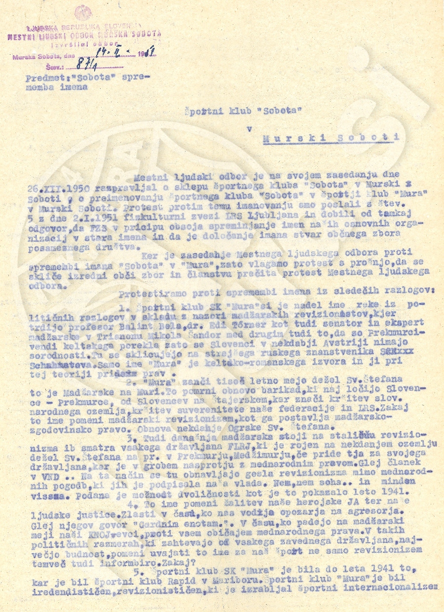 Čeprav si še danes etimologi niso povsem na jasnem od kod izvira ime Mura, je MLO v svojem protestu (preberete si ga lahko v prilogi) navedel besede madžarskih ekspertov, ki so trdili, da je beseda keltsko-romanskega izvora in da smo enakega porekla tudi Prekmurci oz. Vendi. Današnji etimologi po eni izmed teorij trdijo, da se je beseda razvila iz starejšega imena Mōra, ki pa izvira iz ilirskega imena Marus. Marko Snoj v svoji teoriji pravi, da se je ime razvilo iz slovanske besede murъ, ki pomeni temen oz. črn, kar bi lahko pomenilo temna voda. Komunistična oblast je trdila tudi, da si je mladina nadela ime Mura zaradi političnih razlogov, kajti meja Madžarske je dolgo časa bila ravno na reki Muri. V protestu so v sedmih točkah navajali še, da gre pri spremembi imena tudi za žalitev Jugoslovanske armade, da je bil Mura v Prekmurju to kar je bil Rapid v Mariboru (nemškutarski klub). Znano je namreč, da so se med vojno v klub vrinili madžaroni in ga izkoriščali za politične namene, podobno kot ga je nova oblast izkoriščala po vojni. MLO je v obrazložitvi prikazala Madžare in madžarone kot gonilno silo in izvor kluba, čeprav danes vemo, da so bili nekateri igralci in funkcionarji obešeni, poslani v koncentracijska taborišča ali prisilno izseljeni. Navsezadnje je bil prvi predsednik kluba leta 1921 Slovenec Plaskan, član UO-ja pa je bil še Jud Vincenc Arvay, ki so ga Madžari preganjali. Pod protest sta se podpisala predsednik Jože Kološa in tajnik Jože Velnar. Kološa je bil soboški župan od leta 1948 do 1951, Velnar pa od 1951 do 1957. Na koncu protesta so zapisali : "Mi današnjim članom ničesar ne očitamo, čudimo pa se, da jim gornje navedbe ne gredo v glavo. V čem SK Sobota ne odgovarja?"