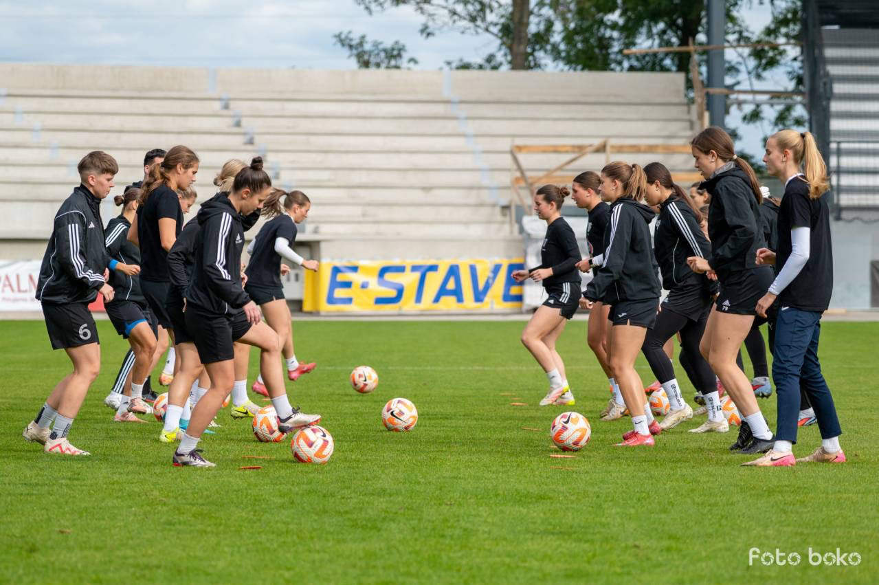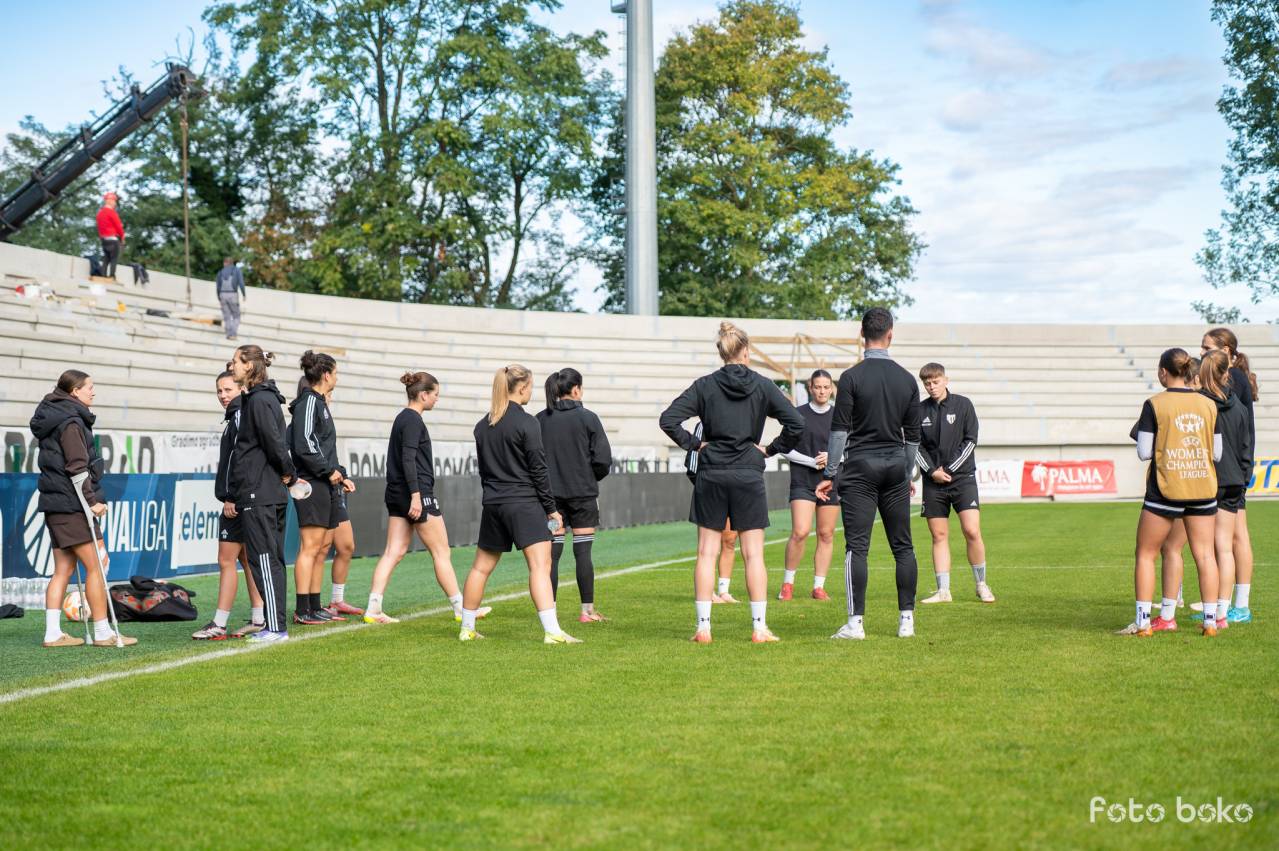 Uradni trening Mure None pred evropskim dvobojem z Dinamom iz Minska. V ozadju poteka gradnja severozahodne tribune. Soigralke je obiskala tudi poškodovana kapetanka Špela Kolbl. Avtorske pravice: nkmura.si Foto: Boštjan Rous