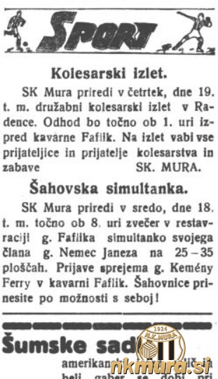 SK Mura je v četrtek, 19. marca 1936 priredila družabni kolesarski izlet v Radence. Odhod je bil ob 13.00 izpred kavarne Faflik. Dan prej, v sredo, 18. marca, pa je klub priredil šahovsko simultanko. Potekala je v restavraciji g. Faflika.