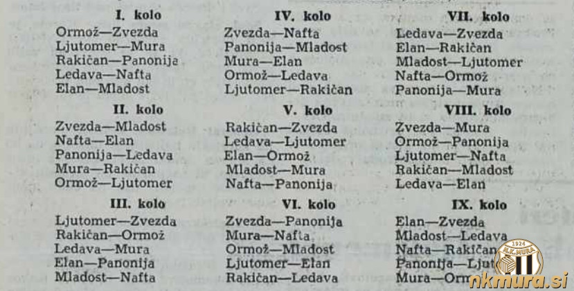 1. Mura II 16 13 1 2 53:24 27 2. Rakičan 16 10 4 2 51:18 24 3. Nafta II 16 10 0 6 45:27 20 4. Ljutomer 16 8 3 5 48:28 19 5. Elan 16 7 3 6 39:32 17 6. Mladost 16 8 0 8 36:44 16 7. Panonija 16 4 2 10 25:47 10 8. Ledava 16 4 2 10 25:60 10 9. Ormož 16 0 0 16 6:48 0