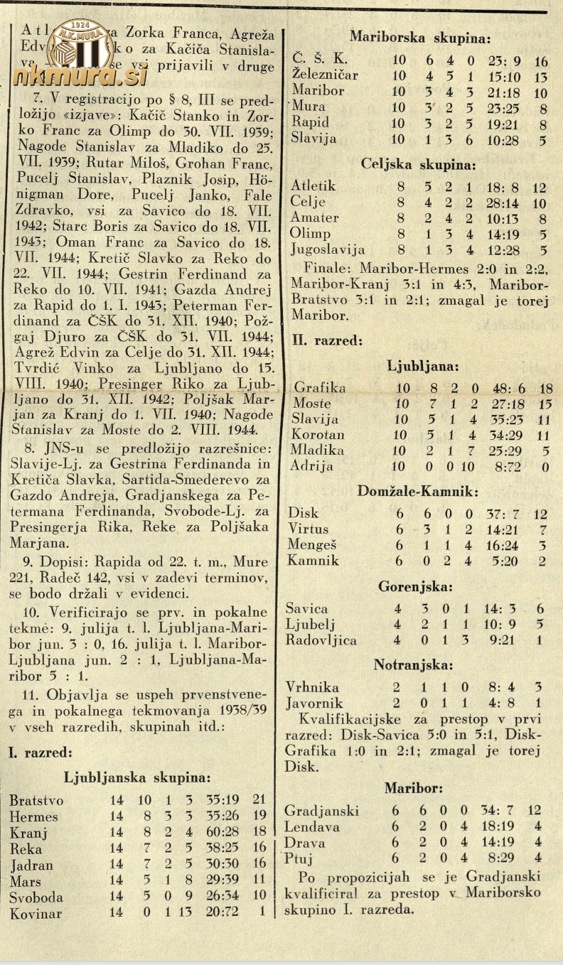 Službeni vestnik Ljubljanskega nogometnega podsaveza J.N.S-a je objavil končne lestvice za sezono 1938/1939. Mura je tekmovala v I. razredu Mariborske skupine in zasedla 4. mesto.