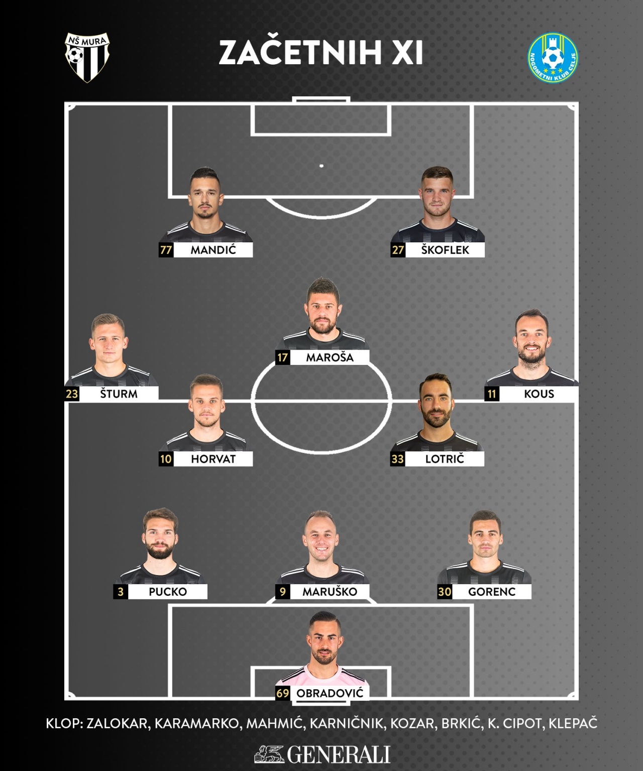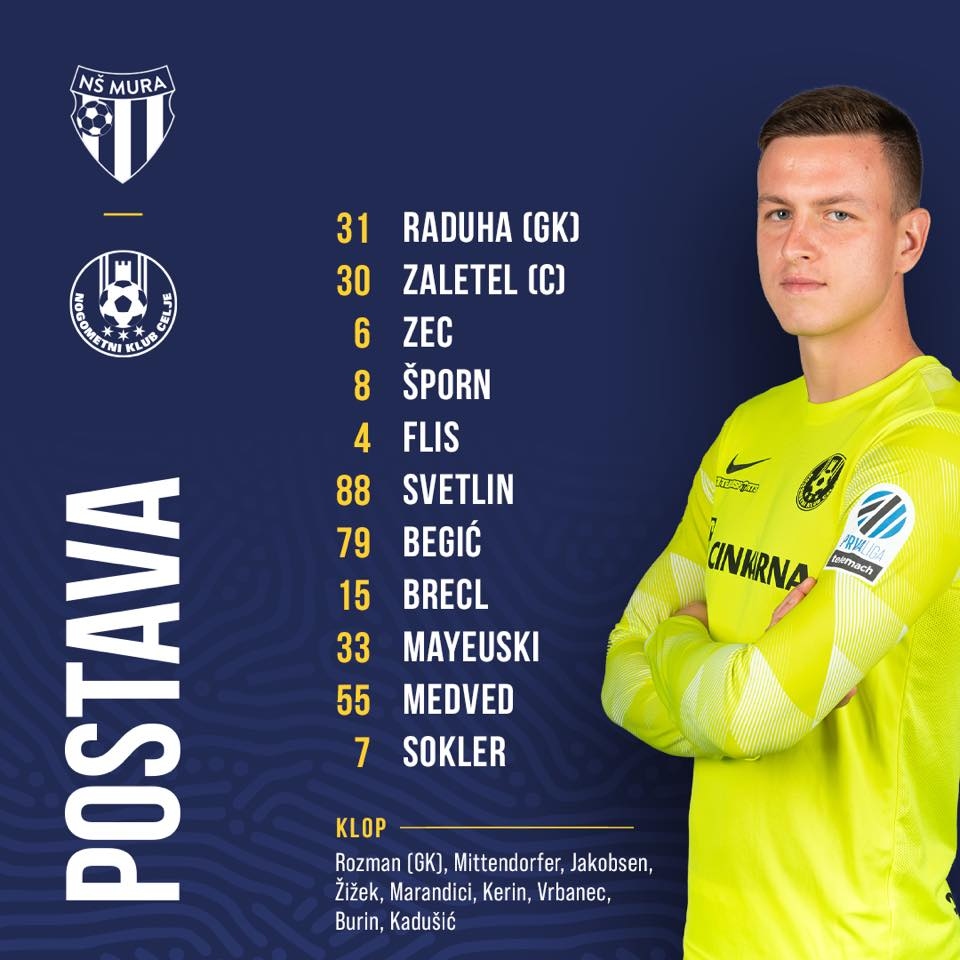 Postava Celja: Raduha, Zaletel, Zec, Šporn, Flis, Svetlin (od 5. Vrbanec), Begić (od 75. Kerin), Brecl (od 46. Kadušić), Majevski, Medved (od 75. Žižek), Sokler (od 64. Jakobsen). Trener: Agron Šalja.