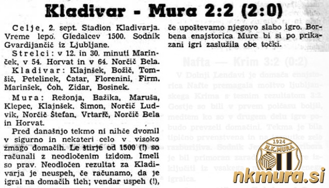 Kladivar je prevladoval v prvem polčasu ko je v 12. in 30. minuti zadel Marinšek. Drugi del je v celoti pripadel Murašem, ki so znižali v 54. minuti, ko je bil uspešen Horvat. Deset minut pozneje, v 64. minuti, je izenačil Bela Norčič. Kladivarju je v drugem polčasu zmanjkalo sape in Muraši bi lahko z malo sreče osvojili obe točki. Pri Muri so bili najboljši Horvat, Vrtarič, Klajnšček in Bela Norčič.