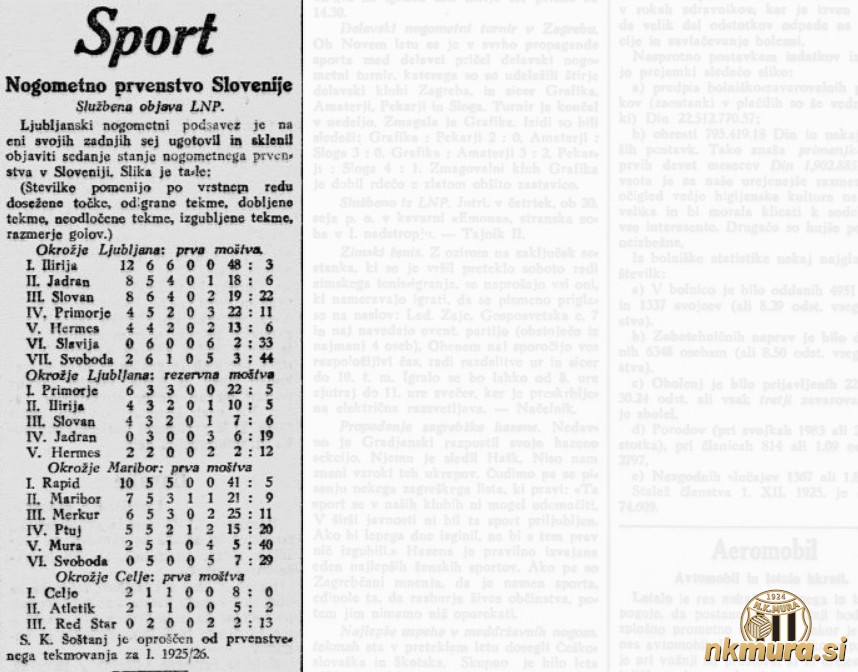 Nogometno prvenstvo Slovenije - stanje na lestvicah. Avtorske pravice: nkmura.si Foto: Jutro, 6. januar 1926