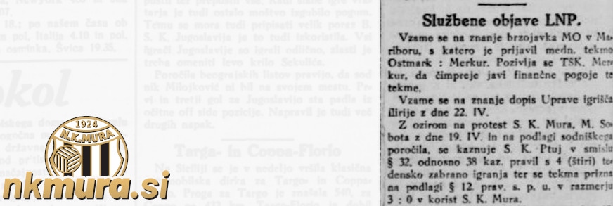 Prvenstvena tekma med Muro in Ptujem (19. april 1925), ki so jo zaznamovali incidenti, je dobila epilog. Ljubljanska nogometna podzveza (LNP) je Muri prisodila zmago s 3:0 in s tem dve novi točki.