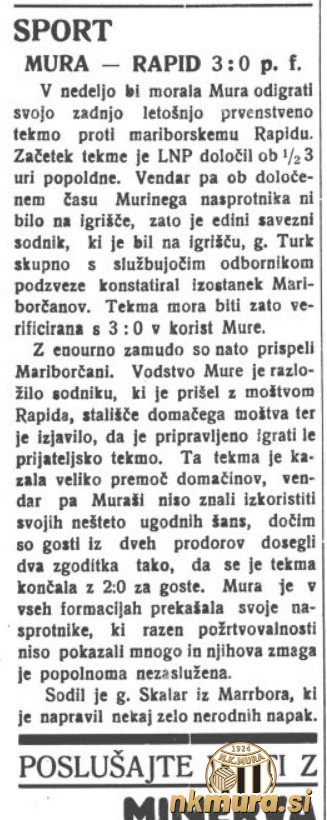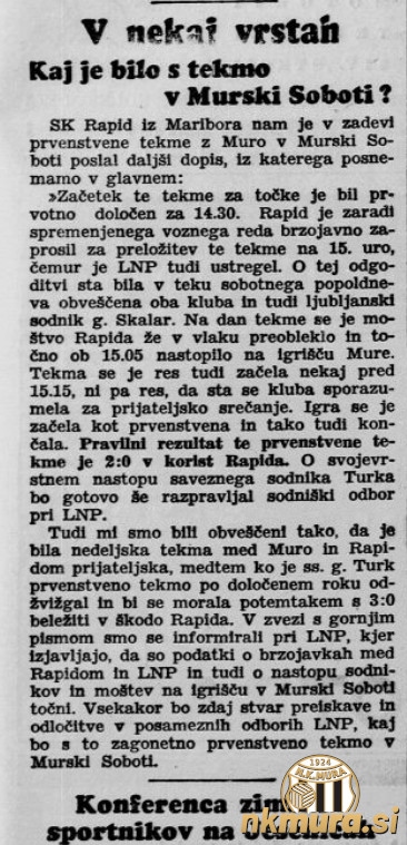 Gostje so se na tekmo odpravili z vlakom, z njimi pa se je peljal tudi zvezni sodnik Skalar. Ker je vlak obtičal v Ormožu, so gostje vodstvu tekmovanja poslali brzojavko v kateri so sporočili, da bodo zaradi prometnih težav zamudili na tekmo. Njihovi prošnji je bilo ugodeno in vodstvo tekmovanja je določilo, da se naj tekma prične z zamudo in sicer takrat, ko Rapid prispe v Mursko Soboto. "Šum" v komunikaciji je povzoročil, da so nogometaši Mure čakali goste ob 14.30 in ker jih ob 14.45 ni bilo je edini zvezni sodnik, ki je bil prisoten na tekmi, Sobočanec Josip Turk, ugotovil, da Mariborčanov ni ter končal tekmo.