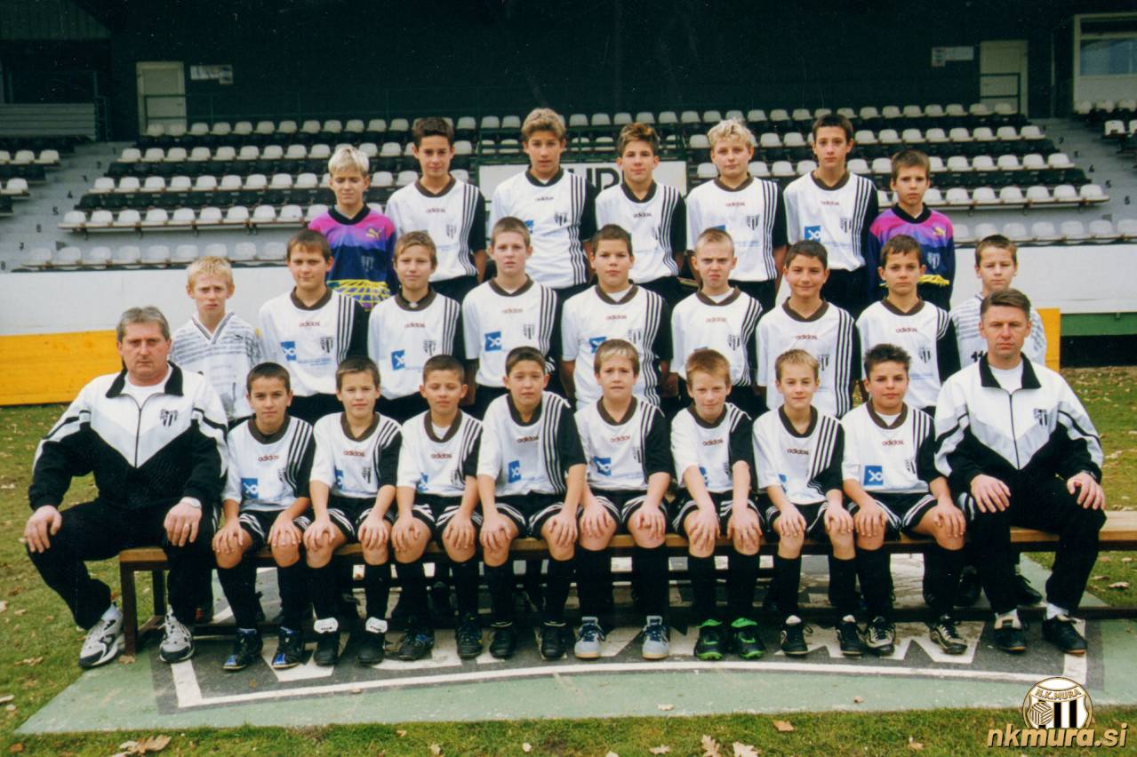 Murina selekcija U12 leta 2002. Matic Maruško sedi tretji z desne. Tega leta je Maruško iz Apač prestopil k Muri. Skrajno desno sedi trener Jani Lipič. Avtorske pravice: nkmura.si Foto: arhiv NK Mura skozi čas