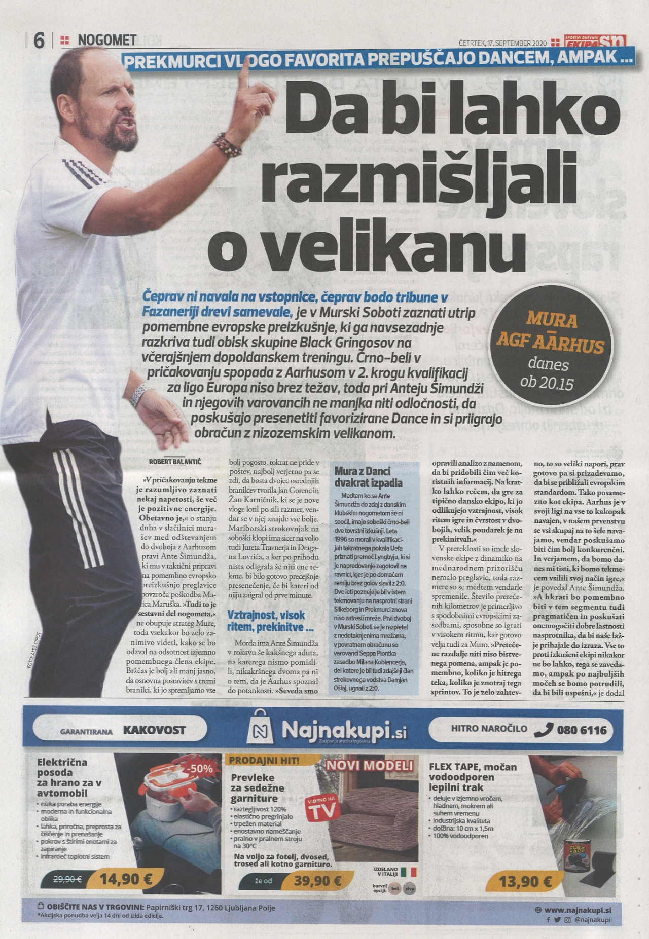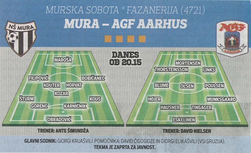 Pogledali smo tudi med danske časnike. Aarhus Stiftstidende piše o skoraj vojaškem režimu, ki je doletel nogometaše Aarhusa v Sloveniji - stroga karantena in hotel brez izhoda. Trener David Nielsen spoštuje Muro. "Mura je resnično dobra ekipa, močna z žogo, igrajo hiter nogomet in so agresivni. Težko je predvideti kako bodo omenjene lastnosti izrazili proti nam. Menim, da bomo morali biti na najvišjem nivoju, če bomo želeli napredovati."