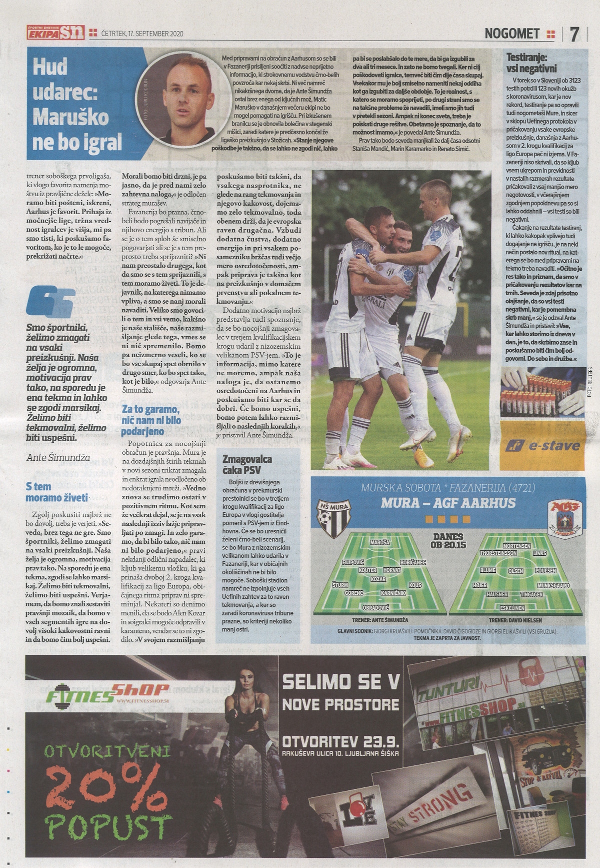Slovenski športni časnik EkipaSN prinaša naslov "Da bi lahko razmišljali o velikanu", pri čemer imajo v mislih nizozemski PSV. Če bo Mura želela priti do nizozemcev, bo morala biti več kot stoodstotna na tekmi proti Aarhusu. Pri Muri zanesljivo ne bo Matica Maruška, ki je na tekmi proti Olimpiji obnovil poškodbo mišice.