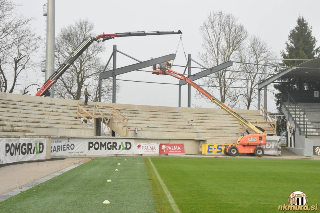 Danes je drugi dan odkar delavci postavljajo streho na novozgrajeni severozahodni tribuni. Nad Mursko Soboto se cel dan vije megla, ki pa dela ne ovira. Trenutno stanje si lahko ogledate na spodnjih fotografijah.