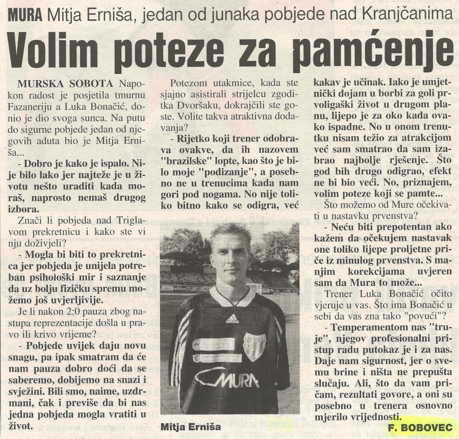 Mitja Erniša je bil eden izmed junakov zmage Mure nad Triglavom. Njegova sijajna asistenca strelcu drugega zadetka Simonu Dvoršaku, je dvignila na noge celoten stadion.
