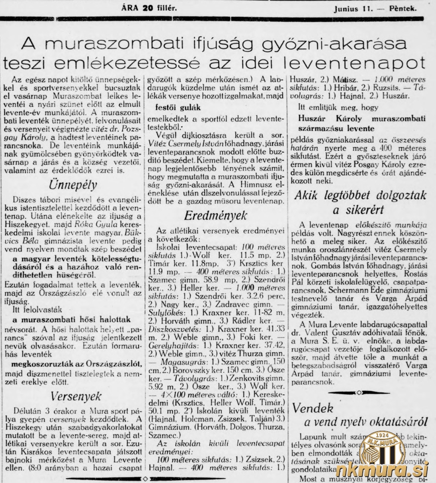 V nedeljo, 6. junija 1943, je v Murski Soboti potekal dan mladih, t.i. levente dan. V vojnih časih, ko so Prekmurje okupirali Madžari, so mladino vključevali v organizacijo, ki se je imenovala Levente. Ker se je nogomet v Murski Soboti še naprej nemoteno igral, je imela Mura zraven prvega in drugega moštva tudi mlado oz. levente ekipo. Zelo podobna organizacija je delovala tudi kasneje v komunistični Jugoslaviji, kjer so mlade sprejemali med pionirje, ekipo pa so imenovali pionirska ekipa.