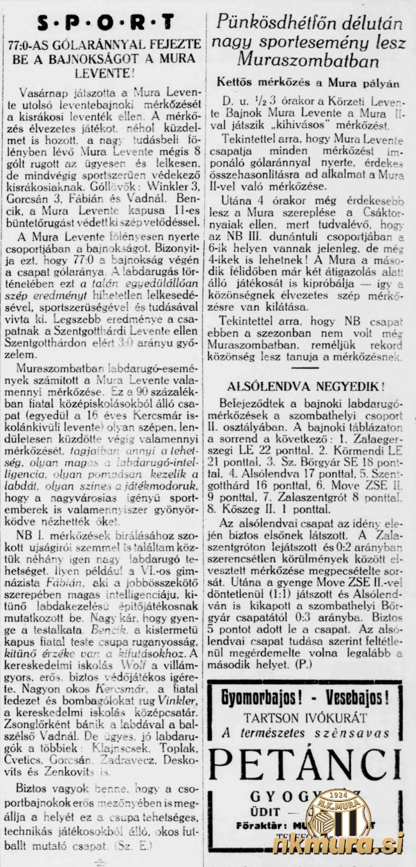 Športne igre so se pričele ob treh popoldne na igrišču Mure, mladi pa so tekmovali v atletiki, zadnjo prvenstveno tekmo v sezoni pa je igrala tudi levente ekipa Mure. Mladi Muraši so s kar 8:0 premagali Kisrákos in prepričljivo osvojili naslov prvaka z gol razliko 77:0. Zadetke so dosegli: Winkler (3), Gorčan (3), Fabian in Vadnal. Vratar Bencik je obranil tudi enajstmetrovko.