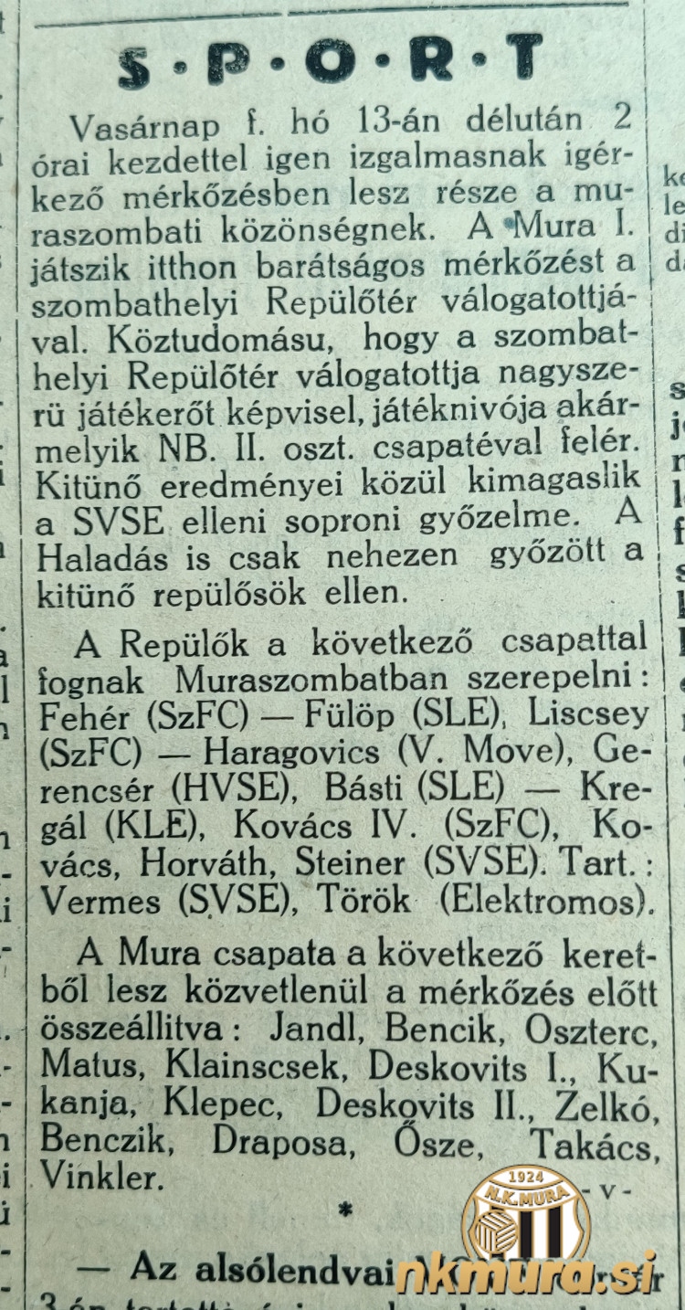 V nedeljo, 13. februarja 1944, bo Mura ob dveh popoldne igrala pripravljalno tekmo proti ekipi sombotelskega letališča. Gre za nogometaše, ki vojaški rok služijo kot letalci oz. aviatičari. Med njimi je tudi nekdanji igralec Mure Jože Gerenčer, ki je po koncu minule sezone odšel na služenje vojaškega roka in sedaj igra za Haladas. Ekipa sombotelskega letališča je po moči enakopravna madžarskemu drugoligašu.