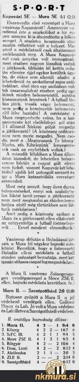 Nogometaši Mure so v 5. krogu prvenstva v sezoni 1943/44 doživeli prvi prvenstveni poraz. Kapuvári je bil boljši s 4:1 (2:1).