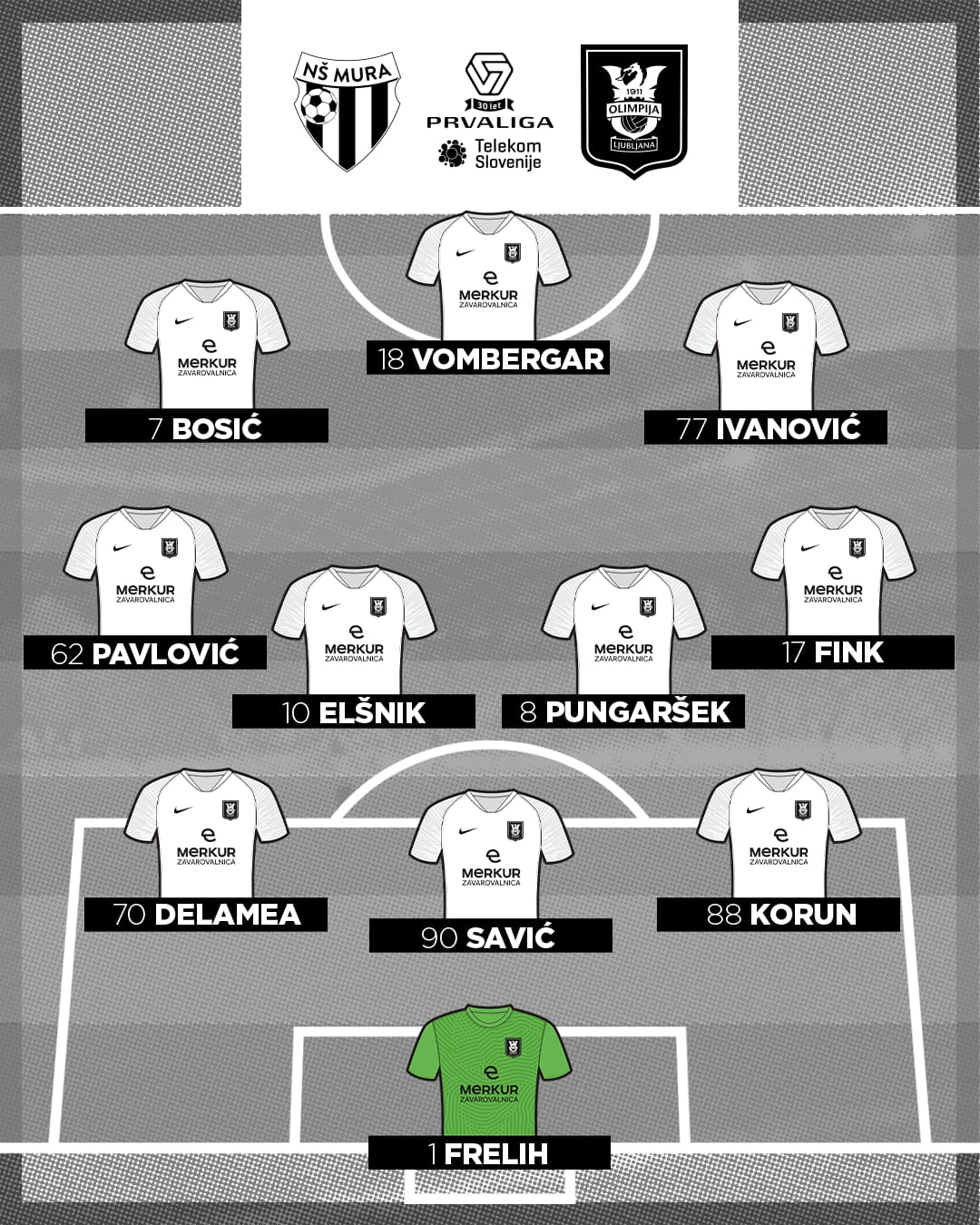 Tudi Olimpija je tekmo pričela s tremi branilci v postavitvi 3-4-3: Frelih - Delamea, Savić, Korun - Pavlović (od 78. Andrejašič), Elšnik, Pungaršek (od 70. Ostrc), Fink (od 80. Boakye) - Bosić (od 79. Kurež), Vombergar (od 78. Kapun), Ivanović.