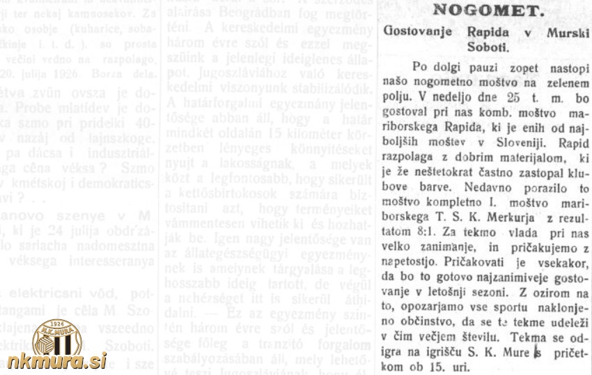 Poročilo s tekme Mura : Rapid. Avtorske pravice: nkmura.si Foto: Tabor, 27. julij 1926