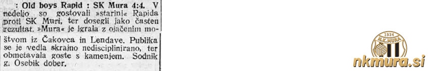 Članska ekipa Mure je po dolgem času znova igrala nogometno tekmo. Nazadnje so na igrišče stopili 7. marca 1926, ko so se pomerili z mariborskim Merkurjem. Po več kot štirih mesecih neigranja so gostili mariborski Rapid. Končni rezultat je bil 4:4.