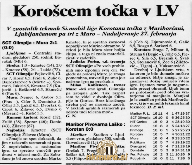 Olimpija je dokazala, da lahko z neprivlačno a racionalno igro unovči prednost v telesni moči. Za Muro je bil usoden Marko Kmetec, ki je zadel v 53. in 57. minuti. Črno-beli so znižali v 72. minuti, zadel pa je Lukič. V celoti je bila Mura boljša a tega ni znala materializirati v zadetkih.