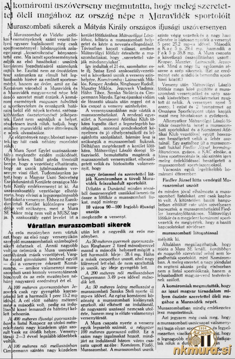 Ob tej priložnosti je bila Mura sprejeta v Madžarsko plavalno zvezo (Magyar Úszó Szövetség, MÚSZ), 22. avgusta pa se je udeležila državnega mladinskega plavalnega tekmovanja Kralja Matjaža.