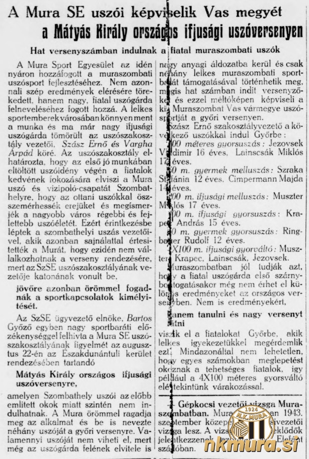 Vodstvo Mure je sprejelo odločitev, da od poletja 1943 znova oživi plavalno sekcijo. Le-ta je delovala vse do druge svetovne vojne, nakar je zamrla. Vodstvo plavalne sekcije sestavljata Ernő Szász in Arpad Varga.