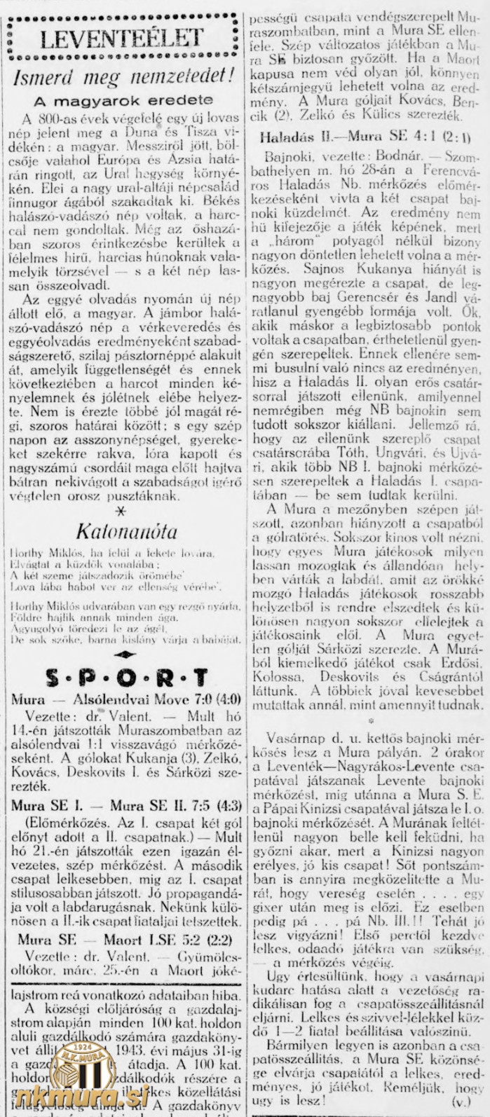 V sredo, 25. marca 1943, je v Murski Soboti gostovala ekipa Maort SE. Zmagali so črno-beli s 5:2 (2:2).