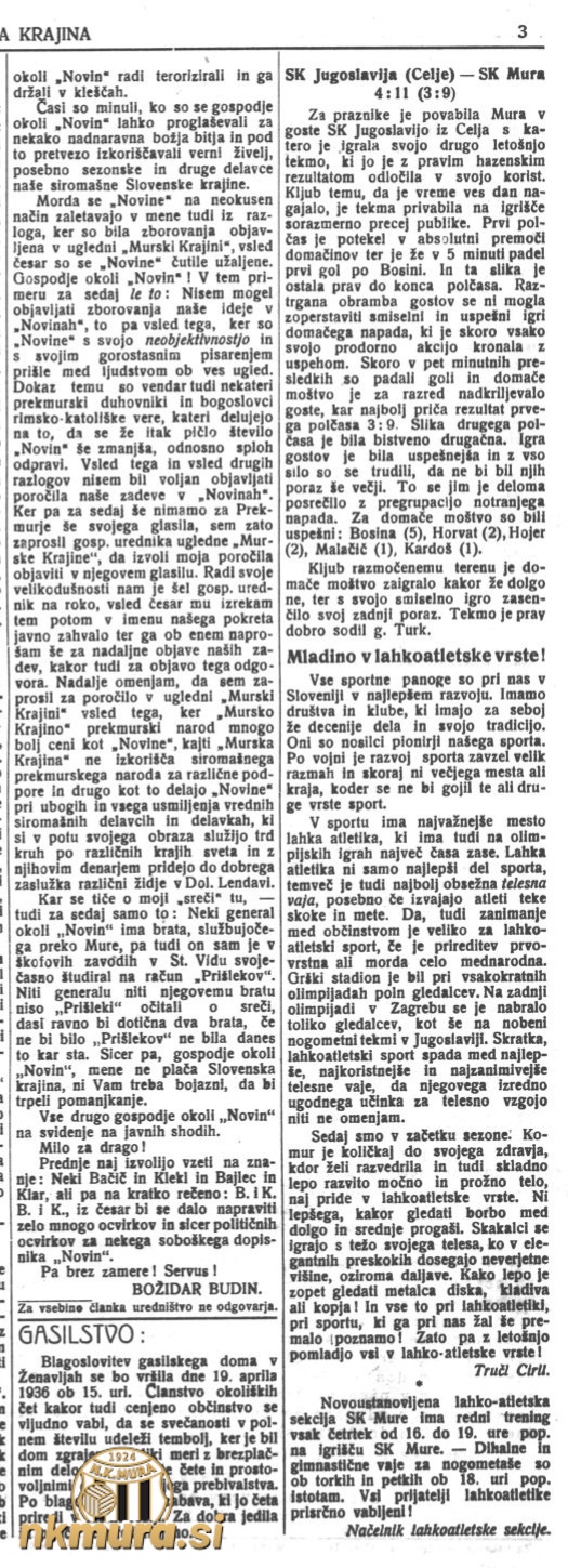 Na velikonočno nedeljo je Mura povabila v goste Jugoslavijo iz Celja in jo premagala z visokih 11:4. Že ob polčasu je bilo 9:3 za Muro. Tekma je bila odigrana na novem stadionu Mure.